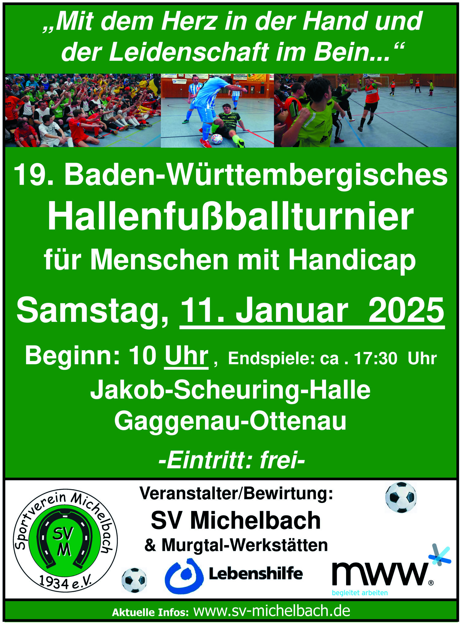 Es ist endlich wieder soweit, unter der Überschrift „Mit dem Herz in der Hand und der Leidenschaft im Bein...“ veranstaltet der Sportverein Michelbach in Zusammenarbeit mit den Murgtal-Werkstätten am Samstag, 11. Januar 2025 bereits zum 19. Male das Hallenfußballturnier für Menschen mit Handicap aus ganz Baden-Württemberg.