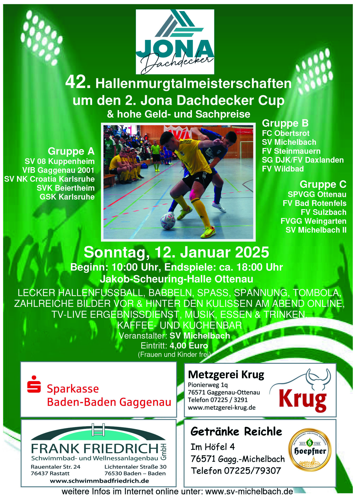 Sportverein Michelbach organisiert die 42. Hallenmurgtalmeisterschaften um den Jona Dachdecker Cup am 12. Januar 2025 in der Jakob Scheuring Halle in Ottenau und das 19. Hallenturnier für Menschen mit Handicap
