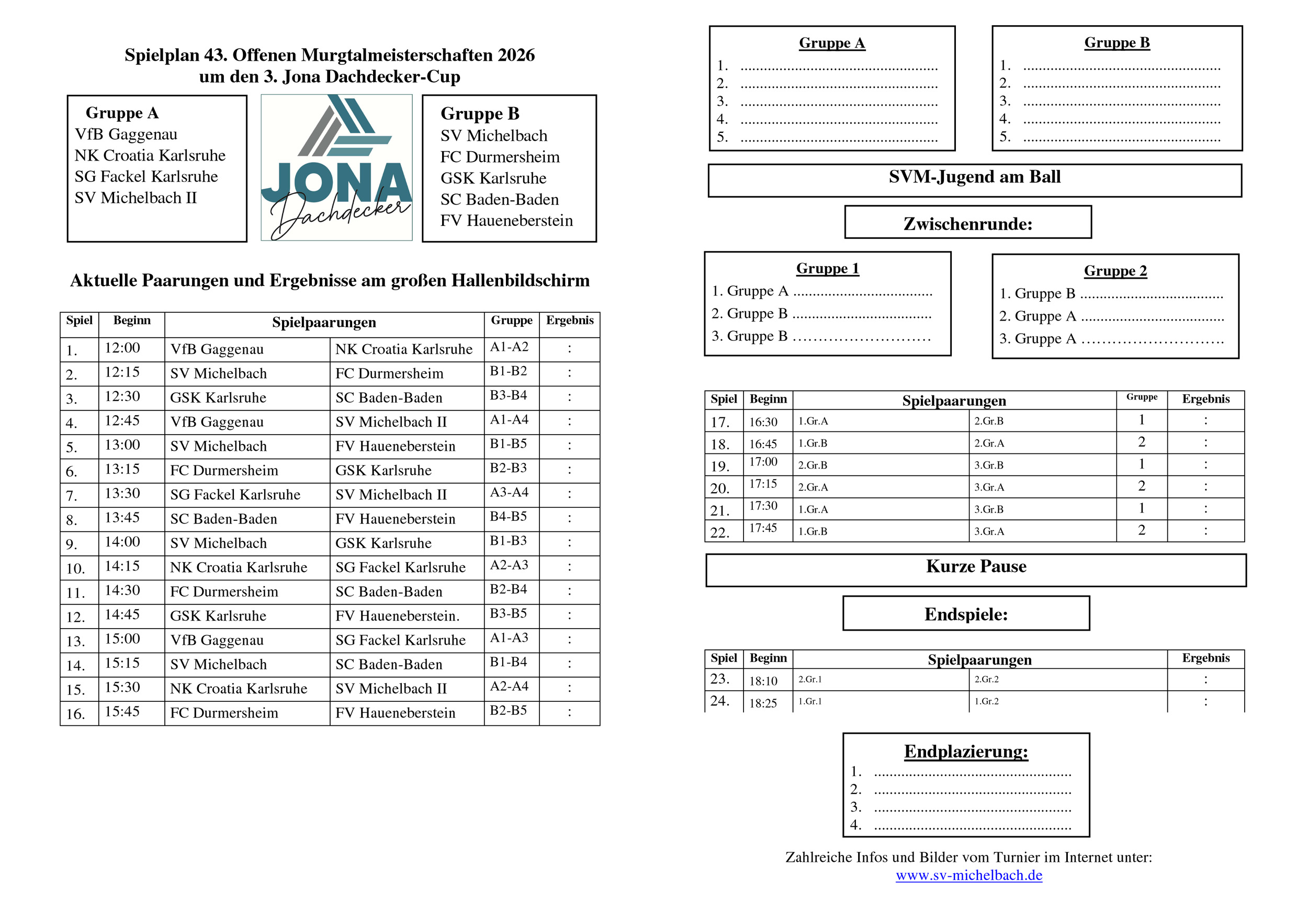 Sportverein Michelbach organisiert die 43. Hallenmurgtalmeisterschaften um den 3. Jona Dachdecker Cup am 11. Januar 2026 in der Jakob Scheuring Halle in Ottenau
