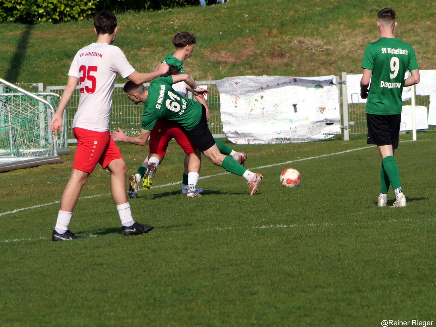 Tolles Fußballwetter, klasse Rasen, konstanter Trommelwirbel durch die eigenen Jugend-Ultra Fans und als Tabellenführer einen weiteren Verfolger im Visier, was will man mehr? Visionen ohne Aktionen sind wie Halluzinationen. Genau so oder ähnlich war es im 1. Abschnitt in Michelbach im eigenen Spiel. Die Einheimischen waren vor allem in der ersten Halbzeit komplett offline. Bereits in der 3. Minute wackelte das Tornetz im eigenen Kasten, als die bestens aufspielenden Gäste schnell und ohne zu zucken den 0:1 Führungstreffer erzielten. Philipp Inci war es im eigenen Gehäuse in den folgenden Minuten zu verdanken, dass es bei der knappen Gästeführung blieb. Aus heiterem Himmel kam Michelbach in der 10. Minute zum 1:1 Ausgleich, als David Draganovic ein vorgezogenes Ostergeschenk der Gästeabwehr gedankenschnell annahm. Sinzheim war weiter Herr im fremden Stadion und kam noch vor dem Pausentee in Folge eines Strafstoßes zur verdienten 1:2 Führung.